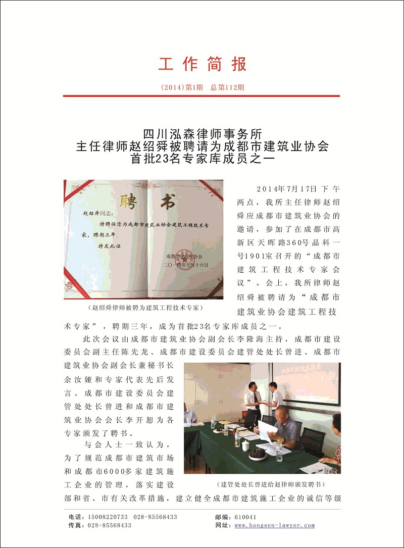 四川泓森律师事务所主任赵绍舜律师被聘请为成都市建筑企业协会首批23名专家库成员之一